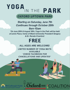 Join us at the Oxford Uptown Park for community yoga! It is FREE and all ages are welcome! There are a limited number of yoga mats, so you may want to bring your own! Check our Facebook page for cancellations and updates!