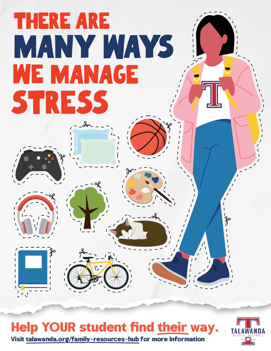 The first set of posters highlights the emotional and social pressures students experience, showing the importance of supportive adults who can help ease those burdens. The second set focuses on ways students can manage stress, encouraging families to help their students explore strategies that work best for them.