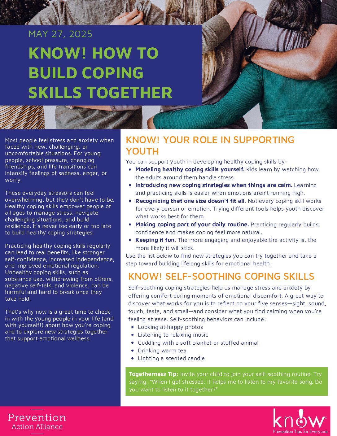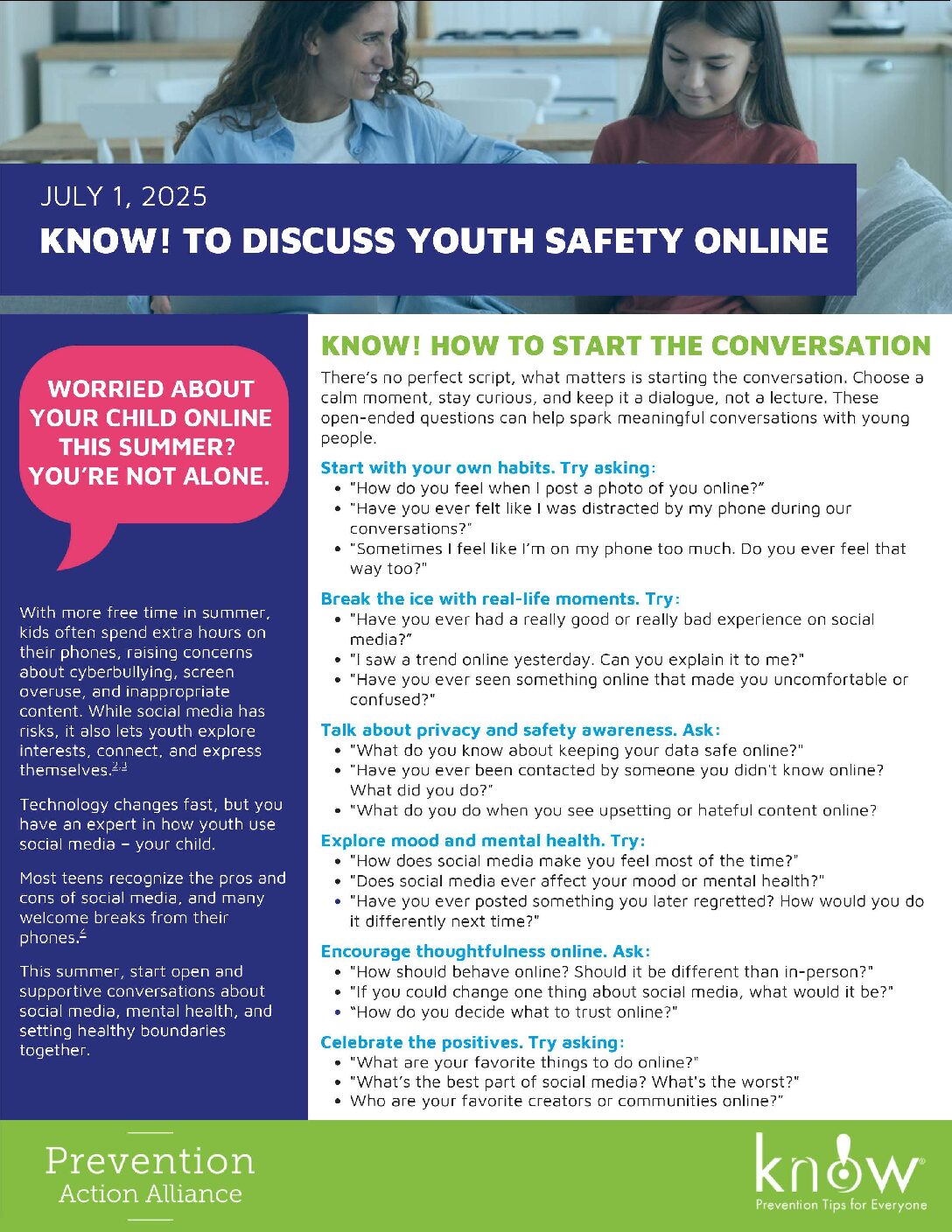 - Know!: A program of the Prevention Action Alliance, bi-monthly tips are mailed to parents of middle school students to aid parents in talking to their children about substance use. To view all resources, click here.
